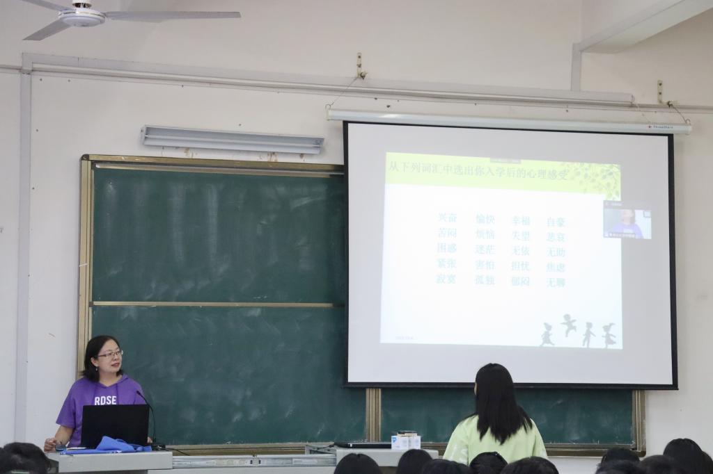 “进入大学后大家有什么样的感受?”周惠玲以提问和分享名言的方式引出话题,学生们敞开心扉:“离开家乡,我感到很寂寞”“面对陌生的同学室友,我总是非常谨慎小心”......面对学生们的诸多学习困惑、交友问题,周惠玲分别从生活环境适应、角色转换适应、学习适应、人际交往适应四个方面逐一解答学生们的问题。