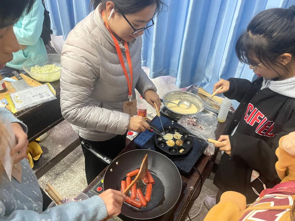 一阵香气从美食协会的招新会场中飘出,吸引了一大群学生从门外涌入围观。走进会场,美食协会的成员正制作着章鱼小丸子——热油滚烫,刚切碎的青菜与准备好的小章鱼一起与面糊下锅。“这是我们第一次制作章鱼小丸子,没想到还挺成功的!”美食协会的会长董心雨边说边端出了一盘热气腾腾的章鱼小丸子。“以美食会友,从柴米油盐酱醋茶中感受美食的魅力。人生在世,唯爱与美食不可辜负!”会长董心雨感叹道。