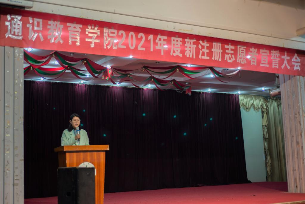 “我愿意成为一名光荣的志愿者。我承诺:尽己所能,不计报酬,帮助他人,服务社会,践行志愿精神,传播先进文化,为社会进步奉献力量”!新注册的志愿者们在大会上庄严宣誓。