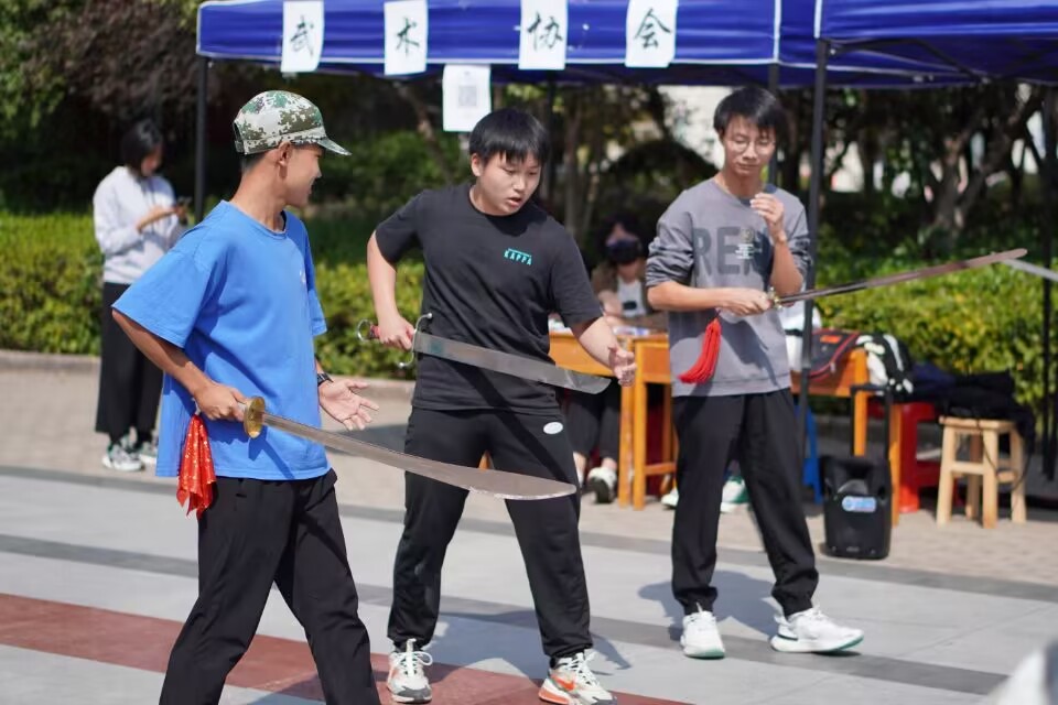 上午十点整,充满力量感的音乐在问津食堂前响起,武术协会发起人招募活动开始。校武术队2022级的成员带来武术表演,围观的学生纷纷拿出手机进行拍摄。同时,学生社团指导中心的成员为学生分发传单,向前来咨询的学生介绍武术协会的相关内容。表演结束后,武术校队的成员还为对武术感兴趣的学生进行了现场教学:双腿微曲、手持软剑、快步向前、扭动手腕、软剑旋舞,一套动作下来引得其他学生也纷纷加入武术教学中。