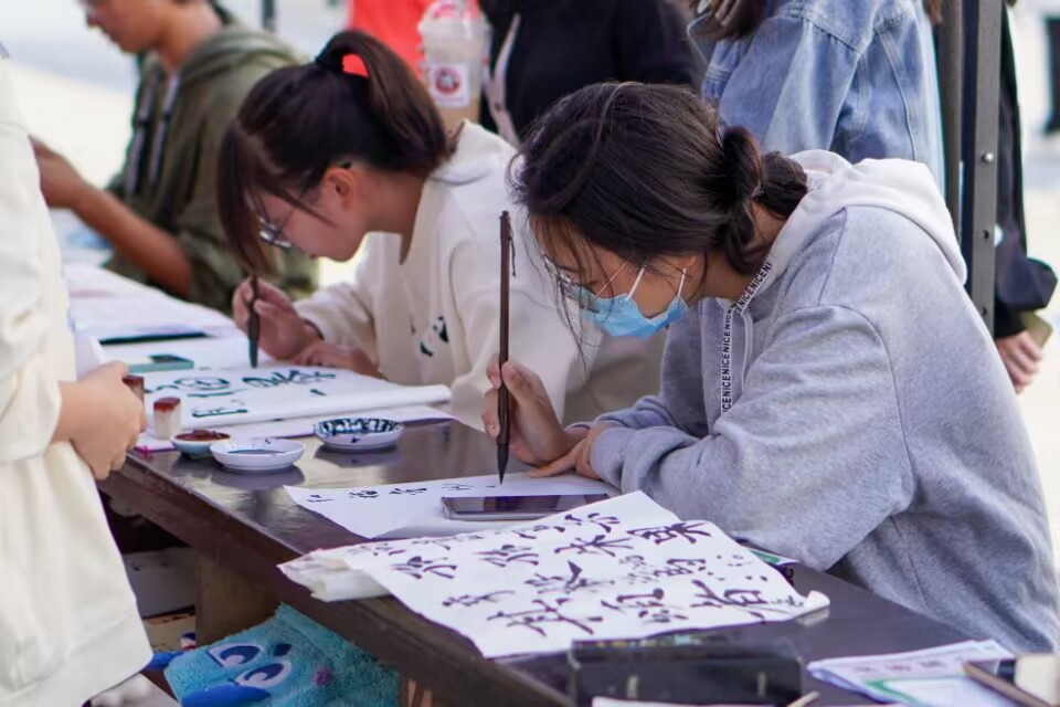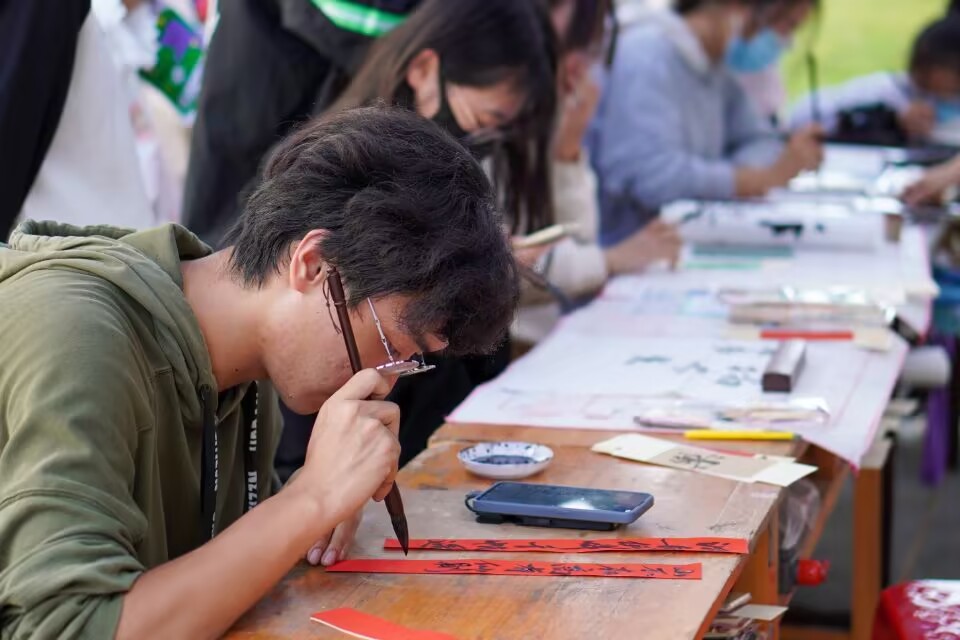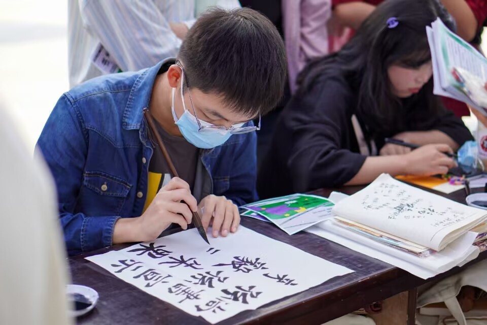 其中,一名长时间认真伏案书写的学生引来不少人围观,他是来自思明习苑的2022级大数据管理与应用专业的学生由扬。据了解,他练习书法长达六七年,书法已达七级,楷书中的欧体、魏碑体、行书等字体他均有练习且尤其喜欢“书圣”王羲之的字。他表示自己会加入书法协会,并希望在协会中获得进步,把字写得更好,扬书法之美。“字写得好让我很快乐,但我对书法不止是书写上的感情,在我书法老师的启发下,我想继续深入发掘它的美。”他说到。