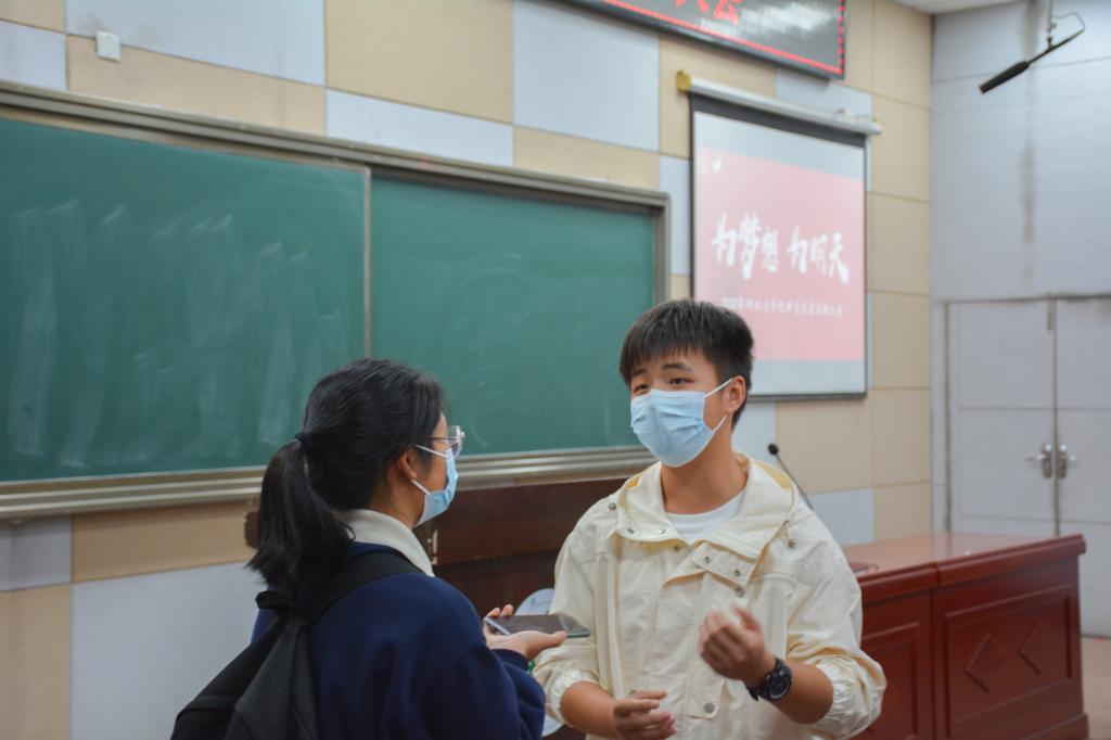 随后,彭道涛亲切地与学生交谈了开学后两个月里的生活近况,并对于学生未来的学习与发展提出建议。他表示,同学们要学会做好规划,不断充实、完善自己,还要敢于做自己,不人云亦云。同时他强调:“希望同学们可以继续发扬志愿服务精神,积极参与志愿奉献的公益活动,在新时代贡献出自己独一无二的力量。”