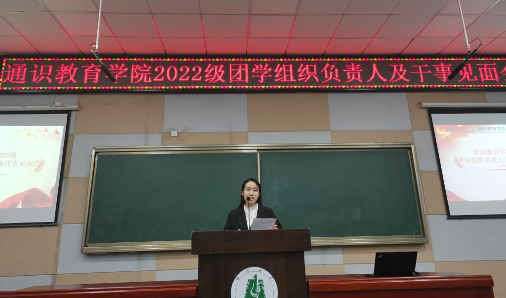 “凝心聚力擘画通识新蓝图,团结奋进争做时代新青年。”2022年10月27日晚,我院于B300举行了湖北大学通识教育学院2022级团学组织负责人及成员代表见面会。学院党委副书记韩凯、院团委负责人胡喆罡、院团委指导老师刘梦锜、院团宣指导老师朱奎闽、学生社区团工委负责人冷自衍、院社导指导老师李鑫泽、院青志指导老师彭道涛以及各团学组织学生干部参加了本次大会。