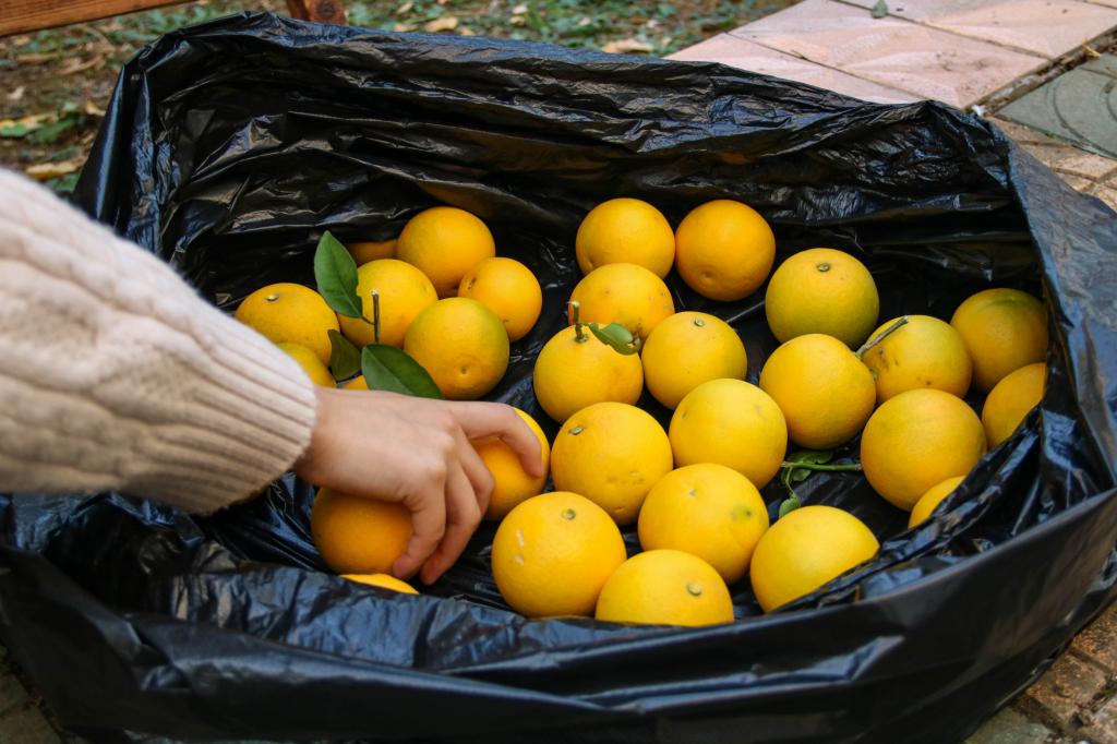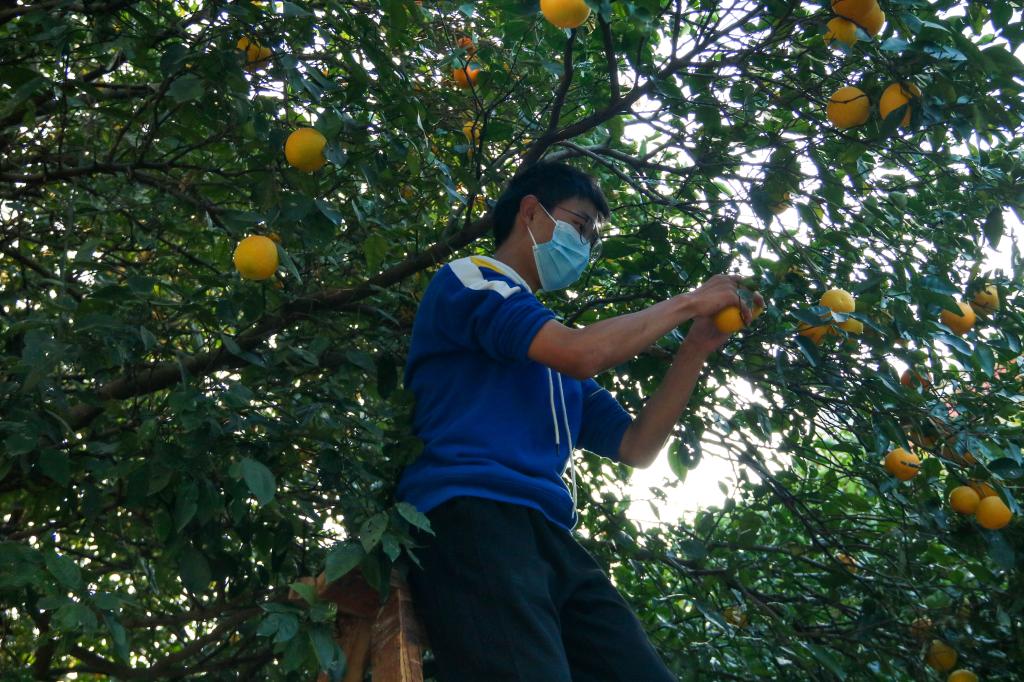 采摘一开始,几名男生尝试着寻找最佳采摘地点,并将长梯放稳。随后,女生们扶着梯子,准备好盛放袋,男生们打头阵爬梯子、摘橙子。“一个、两个、三个……”梯子下的女生们一边数着,一边从男生手中接过沉甸甸的黄橙子并放进袋子里。随着时间的流逝,袋子里的橙子慢慢堆得像小山一样高,学生们的热情却丝毫不减。