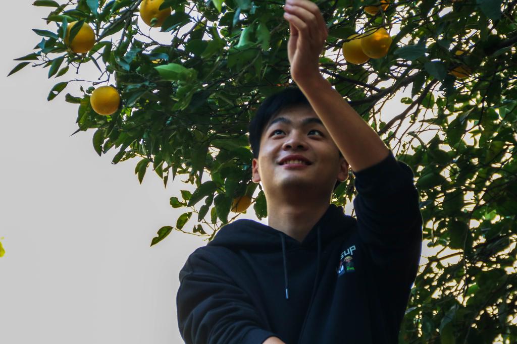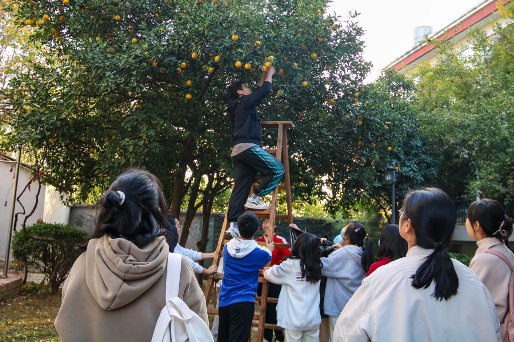 “大家来这边摘橙子吧!”朱奎闽带着十几名学生来到习坎楼小院。一进入院子,学生们便看见黄澄澄的橙子挂在树上,满园都是阵阵沁入心脾的清香。学生们抬着长梯,拿着长杆拾取钳,一边走一边说:“我要摘十个橙子!”“我要摘顶上最红的!”还未开始,学生们都已经迫不及待,兴致昂扬。