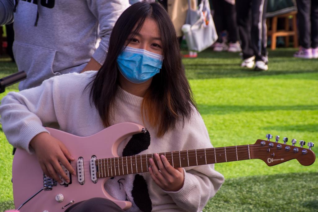 吉他协会会员在场上用吉他演奏起歌曲,许多学生围在台前,静静聆听。吉他协会平时会举办音乐节等活动,学生们能在这里施展才华。“吉他已经成为我们生活的一部分,我们也希望能与新加入的同学一起感受音乐的魅力。”