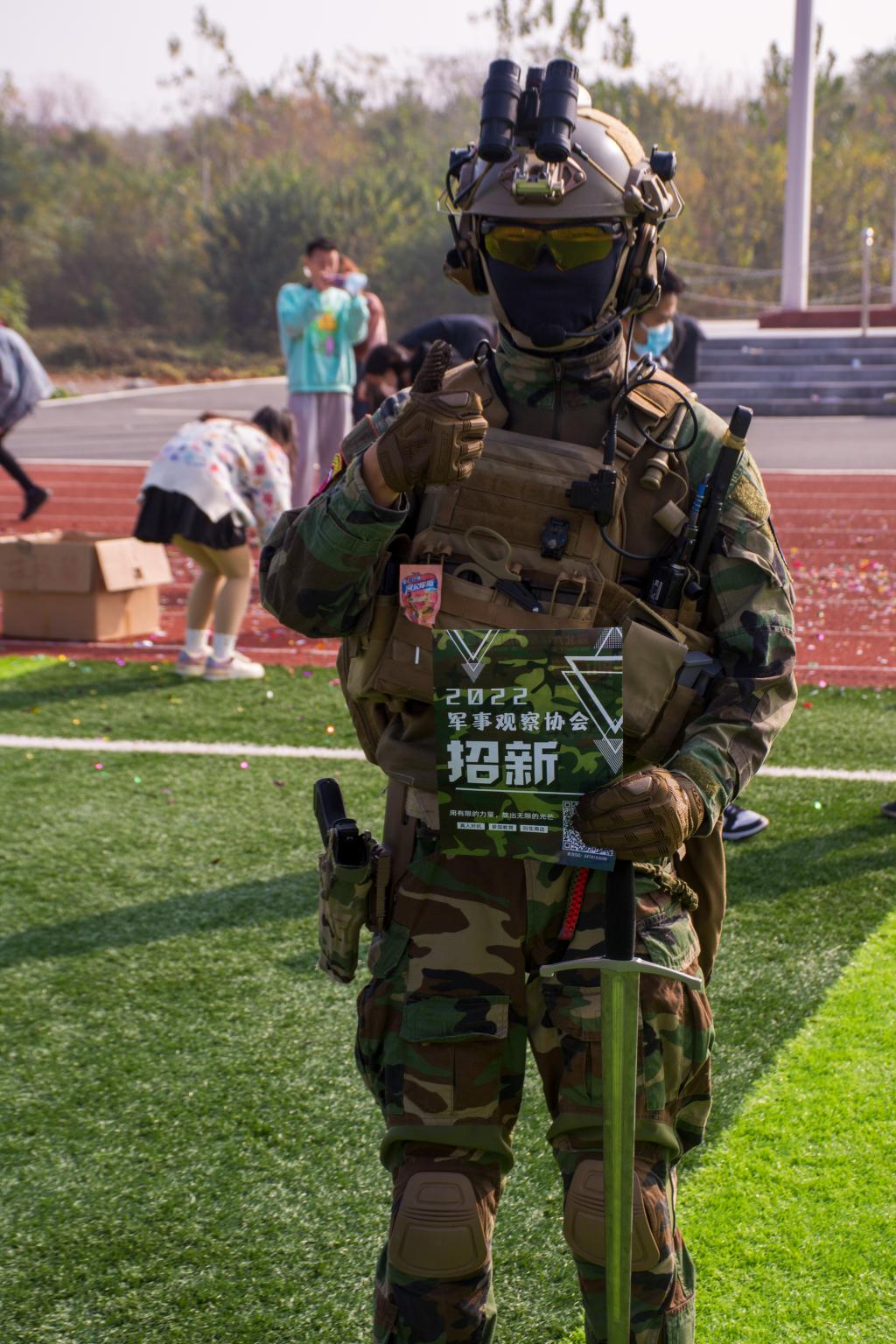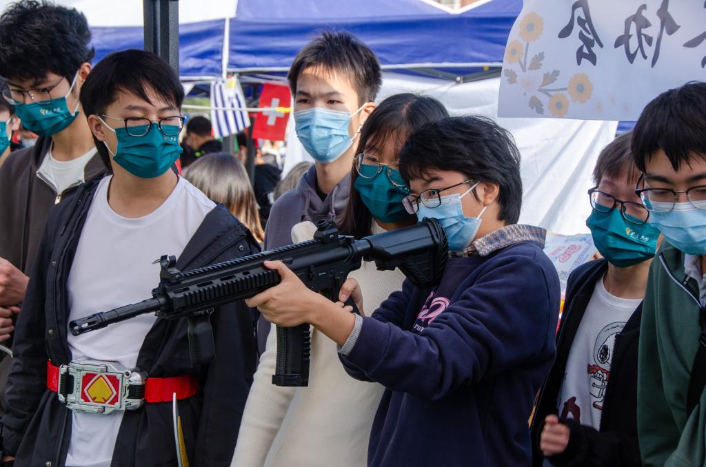 在活动现场出现了身穿军装,手持机枪模型的“小军人”,军事观察协会的会员们正在展示他们的特色社团文化。在这里,学生们玩起了“机枪”。据悉,军事观察协会的活动不仅仅局限于打枪,还包括国防知识竞赛和即将举办的真人CS活动。通过丰富的理论知识总结和实践经验积累,学生们能够在这里感受军事的魅力。“我从小就对这个感兴趣”军事观察协会副会长兼活动策划部部长2021级国际事务与国际关系的唐子砚说:“希望同学们可以通过这个协会爱上军事,可以拥军爱军、参军强军。”