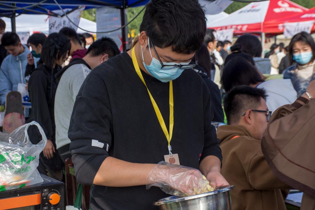 美食协会远远的一缕飘香吸引了许多学生,他们正在做手工饼干。学生们循着香味而来,美食协会的摊位一时间被人群包围了起来。据了解,美食协会还会在平时做雪媚娘、寿司等食物,也常常举办各种美食相关的活动。美食协会副会长2021级化学师范专业的何种钦说:“唯有爱与美食不可辜负!美食自然是生活中不可或缺的一部分,它会给我带来快乐。”