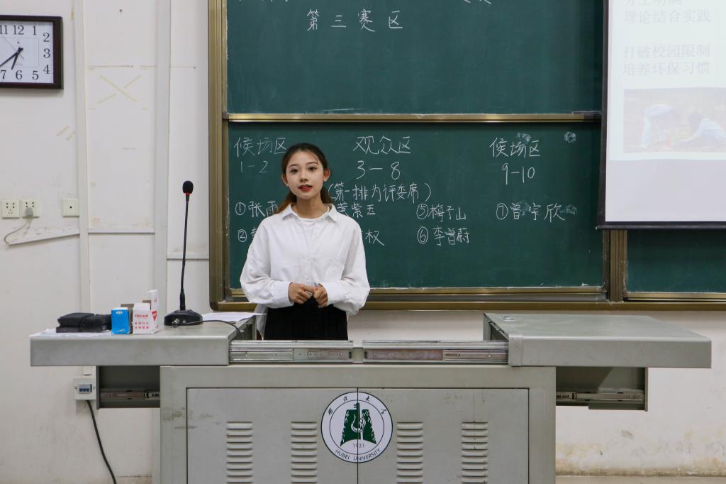 配合着一段古风纯音乐,第三赛区思想政治教育专业的第三小组主讲人沙南云将礼文化的故事娓娓道来。她演讲的主题为《礼文化融入高校思想政治教育研究——以湖北大学为例》,她从礼文化的重要性、礼文化的发展现状、如何发展礼文化以及调查方法这四个方面进行了说明。作为该赛区中唯一一位使用背景音乐的选手,沙南云分享:“如果只是口头演讲,观众可能无法真正地代入角色,以音乐为辅能让人身临其境地体会中华传统的礼文化。”