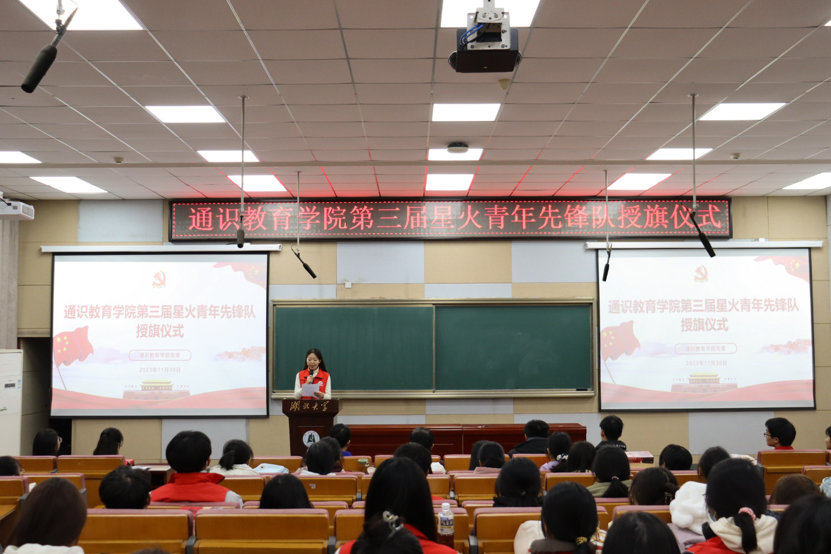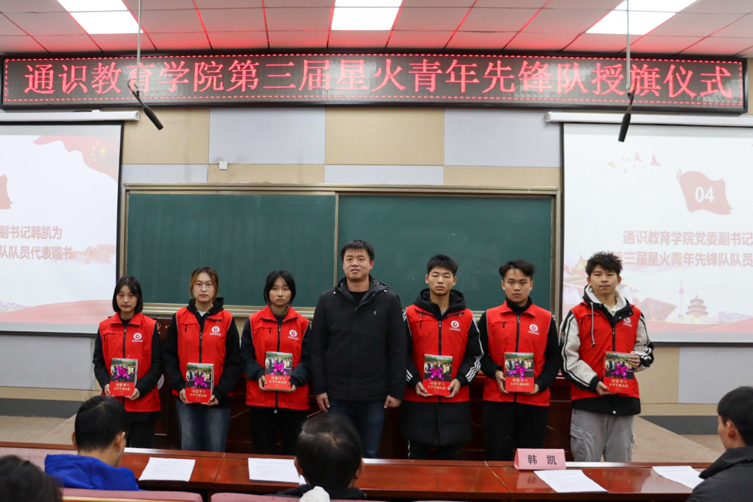 11月30日中午,通识教育学院第三届星火青年先锋队授旗仪式在B300举行。学院党委书记廖良才、副书记韩凯、学工党支部教师代表以及第三届星火青年先锋队全体队员出席仪式。第三届星火青年先锋队队员倪卓玥主持仪式。