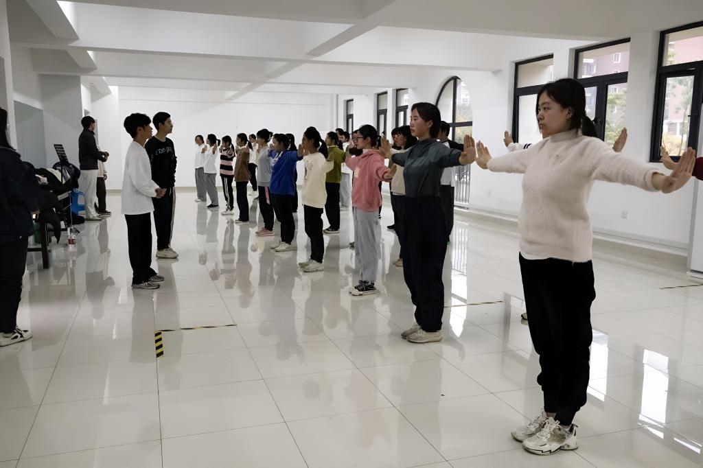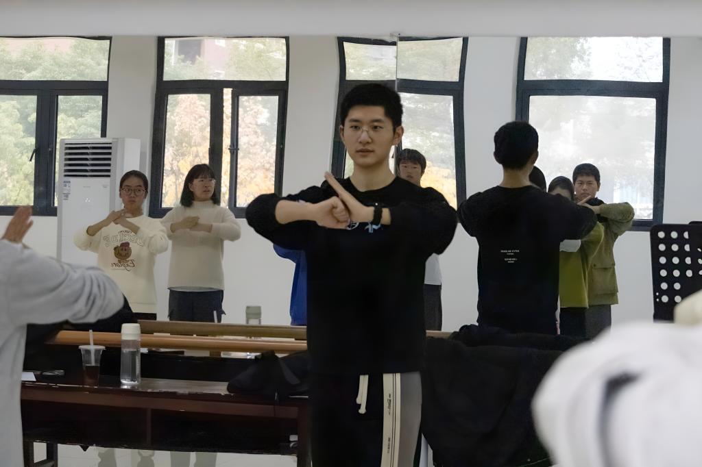 “两臂打开,左手为掌,右手为拳。”在进行简单的热身跑和拉伸后,2022级体育教育专业余鑫煜带领同学们学习抱拳礼。随后,他又展示了弓步、马步、扑步、虚步、歇步五种步法并逐一讲解要点:“弓步前腿要90度弯曲,马步膝盖要打开,扑步上身要挺直,虚步重心在后腿,歇步左腿要向里。”