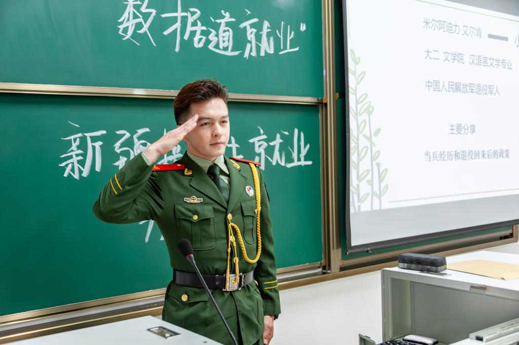 作为一名光荣的退役军人,2022级汉语言文学专业学生米尔阿迪力·艾尔肯向学弟学妹们分享了自己在西藏地区服役的经历。他投身边疆,为保家卫国贡献力量的点滴故事深深感染了在座的同学们。