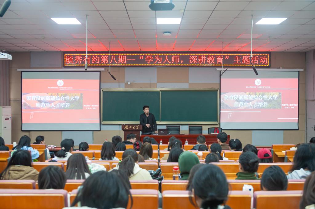 讲座主题为“美育浸润赋能综合性大学师范生人才培养”,师范学院音乐教师程乾分享了如何辨别美、感知美、享受美的独到见解,并通过问答互动的方式,引导学生们进一步探索艺术之美。他强调:“艺术是使你拥有向美而行的态度和看待世界的角度。”同时,他还结合师范生的专业特性,阐述了美育浸润对于提升文化自信、推动中国文化走出去的重要意义。