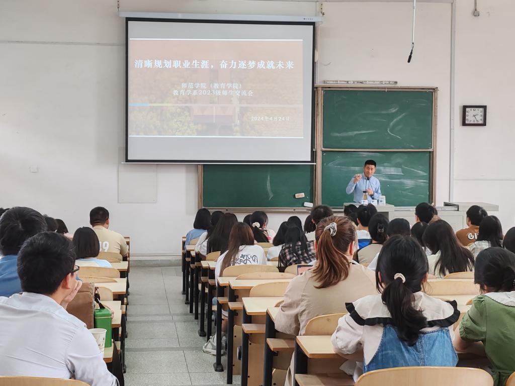 4月24日下午,师范学院“清晰规划职业生涯,奋力逐梦成就未来”交流宣讲活动在问津楼B312、B503、B504分别面向教育学、教育技术学、心理学2023级学生开展。华中师范大学教育学院副教授伍远岳、师范学院(教育学院)副院长杨旸、师范学院(教育学院)师生代表参加活动,2023级教育学、教育技术学、心理学专业全体学生参加活动。