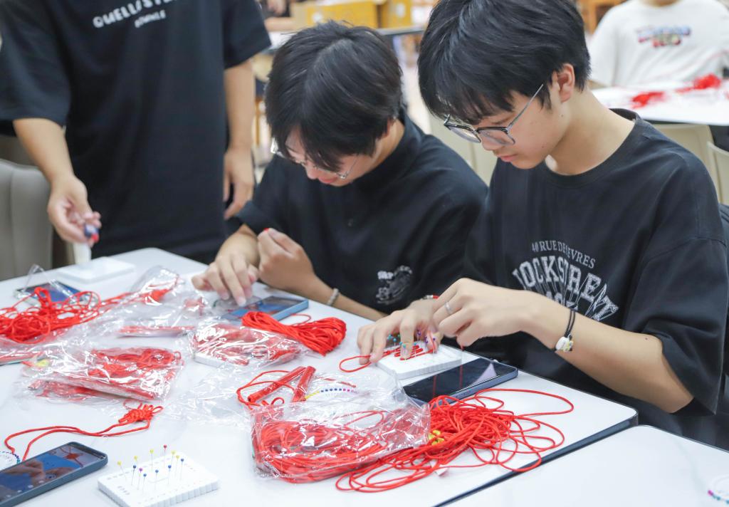 跟随教学视频的指引,学生们将丝线的一端固定在海绵板上,另一端握在手中,他们全神贯注地注视着红线,小心翼翼地完成着“翻转”“缠绕”“联结”等一系列动作。随着手指的灵活翻飞,红线逐渐展现出流畅的弧度,一个个精美的中国结显现雏形。