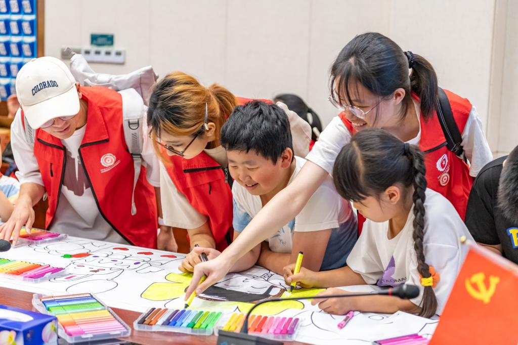 活动现场,志愿者引导孩子们用水彩笔在画卷上涂上五彩斑斓的颜色,进行艺术创作,让孩子们在欢乐中感受节日的氛围。两个小时过去,我院学子与社区儿童合力完成一幅幅充满童趣和想象力的画卷。
