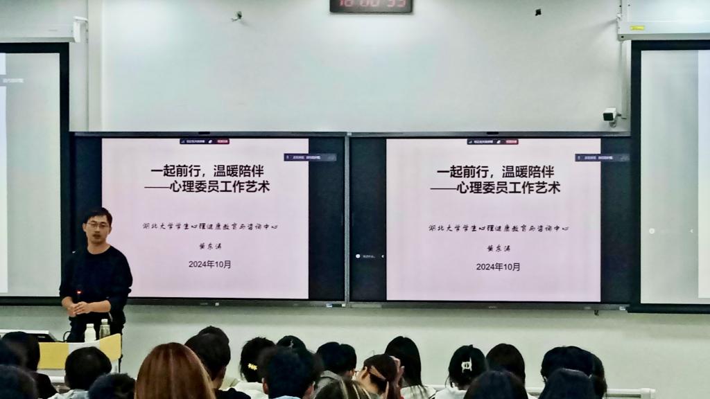 随后,黄东涛通过一系列生动的案例分析,向心理委员们传授了识别常见心理问题的有效方法和技巧。他强调:“心理委员需要学会如何敏锐地发现同学中的焦虑、抑郁等情绪问题,并在面对紧急情况时迅速采取恰当的干预措施。”同时,他还详细阐述了心理委员的工作职责、工作方法,包括如何策划和组织班级心理活动、如何与学生建立有效的沟通渠道并进行倾听等。
