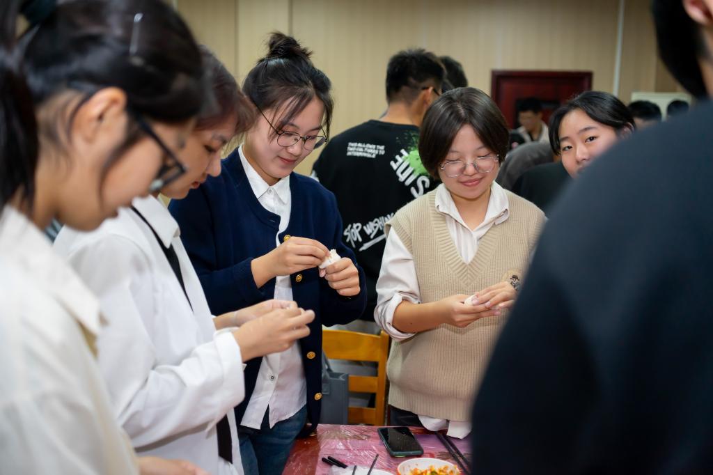 “立冬不仅象征着寒冷的到来,也蕴含着对温暖和团圆的渴望。因此在立冬之日,饺子成为千家万户饭桌上不可或缺的美味佳肴,象征着喜悦与祈福的仪式感。”活动学生负责人仇晨昕向大家介绍道。随后,学生们在欢声笑语中开始了包饺子的活动。