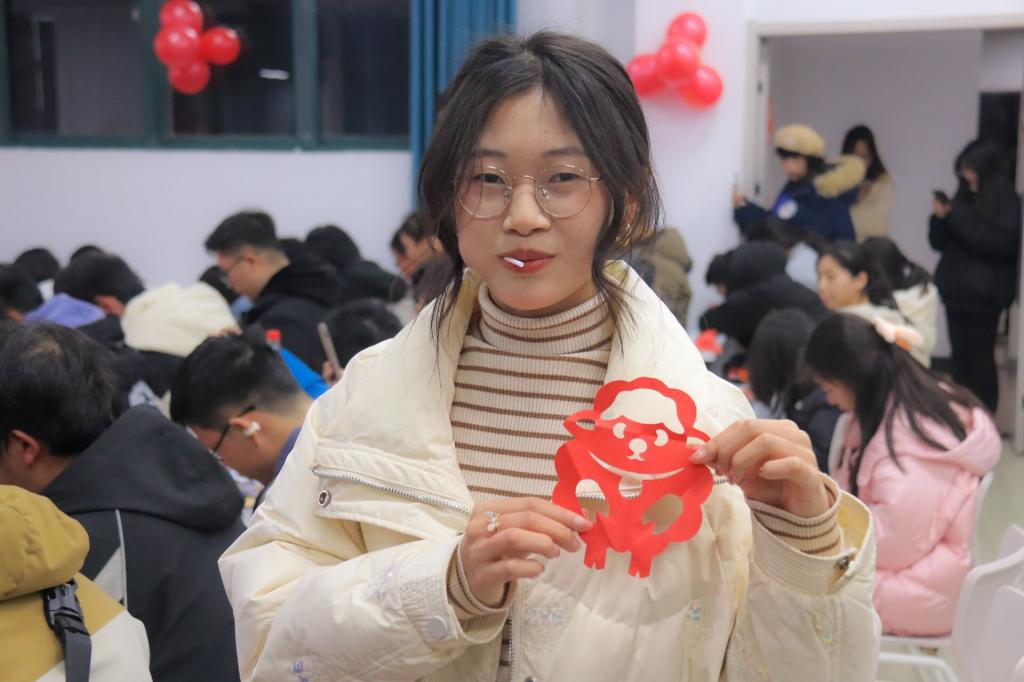 此外,晚会期间还穿插了剪纸、诗词、灯谜等冬至传统文化活动,让大家在享受欢乐的同时,也感受到了我国优秀传统文化的魅力。在剪纸游戏中,学生们亲手创作出了一张张精美的剪纸作品;在诗词活动中,大家以“春”“冬”“花”等关键词为落点,踊跃抢答,展现了自己的才情和文学素养;而在猜灯谜环节中,学生们更是积极参与,通过回答问题赢取了小花灯等精美礼品,收获了满满的参与感和幸福感。