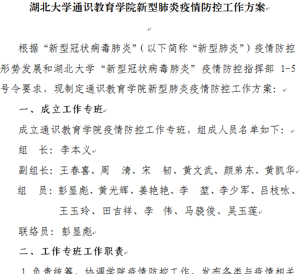 建章立制,狠抓落实。1月24日,学校指挥部发布一号通知。学院党委快速响应,制定《湖北大学通识教育学院新冠肺炎疫情防控工作方案》,指导成立疫情防控工作专班,结合学院实际,对疫情防控工作分区划片、明确分工、压实责任,为疫情防控工作的顺利开展提供制度保障,确保各项防控措施落细落小落实。此外,学院党委紧跟学校党委和指挥部步伐,结合实际细化工作要求后发布《通识教育学院疫情防控工作专班通知》,做到信息精准传达,确保各项工作有章可循、有据可依。