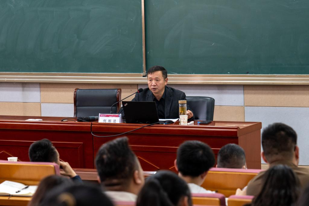 随后,校党委宣传部常务副部长何顺进作了《依靠顽强斗争打开事业发展新天地——学习党的二十大精神及习近平总书记关于斗争精神系列论述的体会》的主题辅导报告,从党的二十大报告的主要内容及重要意义切入,围绕斗争精神这一主题,从 “斗争”在党的二十大报告中的出现频率、新时代强调“斗争”的必要性、新时代新征程如何增强斗争本领三个方面展开分享,以党的奋斗历程激励在座师生踔厉奋发、行稳致远。他指出,要加强对党的思想精神的学习,真正理解贯彻“斗争”精神,在我国现代化建设事业中贡献力量,实现人生价值。他强调,全面建设社会主义现代化国家、全面推进中华民族伟大复兴的大幕已全面开启,新时代,机遇与挑战并存,我们要时刻做好充分的斗争准备,认清习近平主席提出的“五种风险挑战”,把握斗争规律,敢于斗争、善于斗争,依靠顽强斗争打开事业发展的新天地。