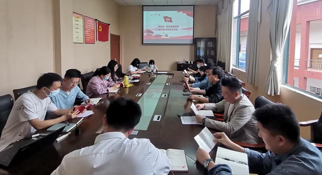 会议通报了党员到会情况和5月交纳党费情况,支部党员合唱国歌、重温入党誓词,并集体诵读《中国共产党章程》第二章“党的组织制度”第十条内容。