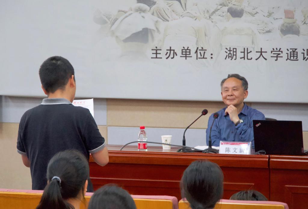 陈文新指出,对四大名著各自生活空间和行为主体的考察不仅有助于加深对经典的理解,也有助于深化对社会人生的认识。陈教授对专业问题认识深刻独到,讲解风趣幽默,现场气氛活跃。讲座结束后,陈文新耐心解答学生们提出的问题。