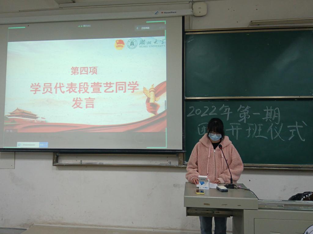 学员代表、2021级中国语言文学类专业段萱艺同学发言。她说,团校是锻炼意志,提高思想觉悟的课堂,她很幸运能在建团百年之际进入团校学习。大家应志向高远,时刻鞭策自己,磨练自己,坚定信念,用正确的理念武装头脑。