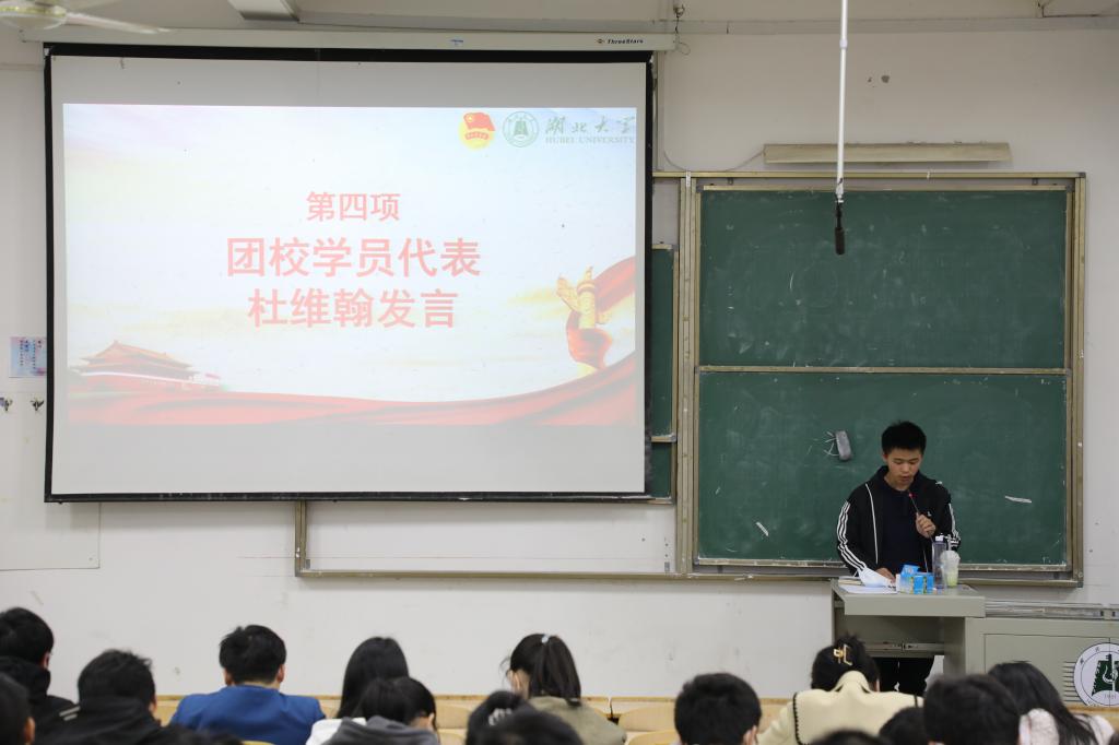 随后,2021级工商管理类专业杜维瀚同学作为学员代表发言。他首先对团校老师们的悉心教导表示了感谢。他谈到,本次能够系统的进行团史的相关学习是难得的机会,在课堂上的同学们能够感受到老师们心中坚定的信念感,也促使同学们坚定理想信念,牢固树立起共青团员为同学们服务的思想。同时,他还倡导同学们充分发挥共青团员的带头作用,希望同学们在课前五分钟宣讲活动中积极学习团史、党史等知识,围绕学院的各项工作积极贡献自己的力量。