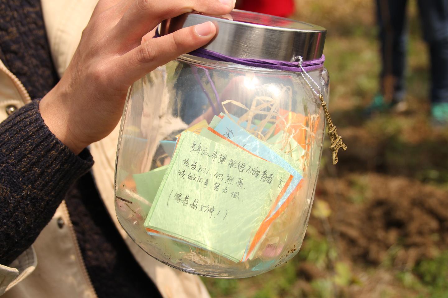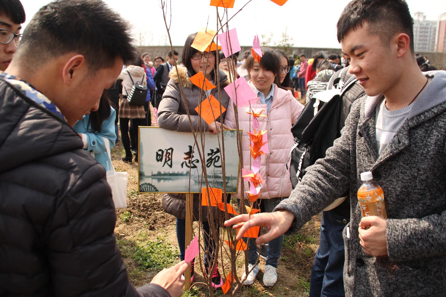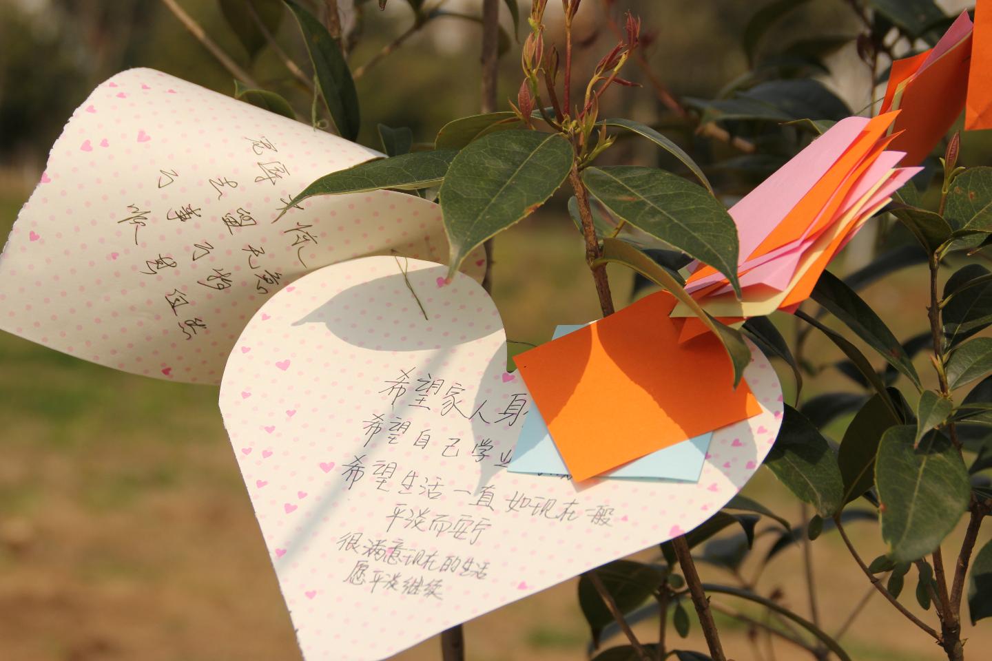 “我的愿望是,2016年瘦十斤!”挂在各个习苑树上的心愿卡片,成为了这次活动的亮点。明志苑将心愿卡片叠成千纸鹤模样挂在树梢,引来学生惊呼“好有创意”;思齐苑的学生借鉴“时光胶囊”这个创意,将所有心愿卡片放在玻璃罐中,随树苗一起埋在土里,他们表示,“等到过几年,我们就会把心愿瓶挖出来”;弘毅苑的学生将心愿卡片直接穿插在树枝上,远处看,活像树苗上的花骨朵儿;明俊苑的“50人大队伍”种下了9棵桂花树和枇杷树,一字型排开后以红绳串接,将心愿卡片串联••••••