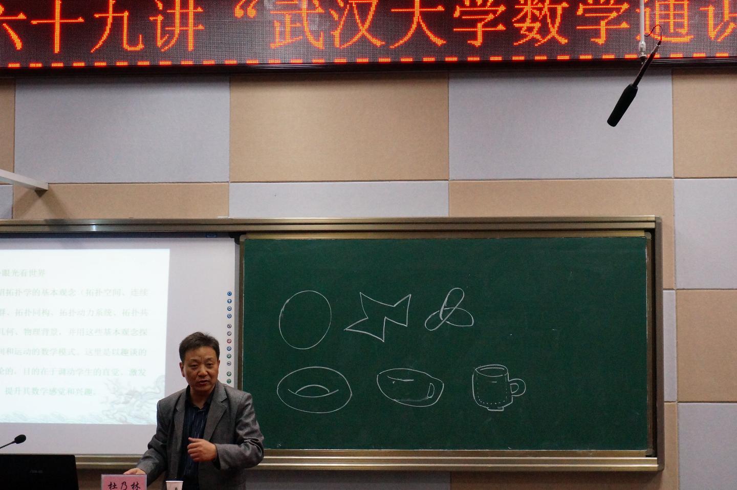 杜乃林的报告妙趣横生。讲到什么是拓扑眼光时,杜乃林在黑板上画了几个简单的不同空间维度的的图案,并问同学们这些图案是否存在不同,不一样的回答揭示了拓扑眼光在每个人身上的的存在与否。杜乃林还结合现场演示,对数学归纳法中的三段论、罗素悖论进行了有趣分析。