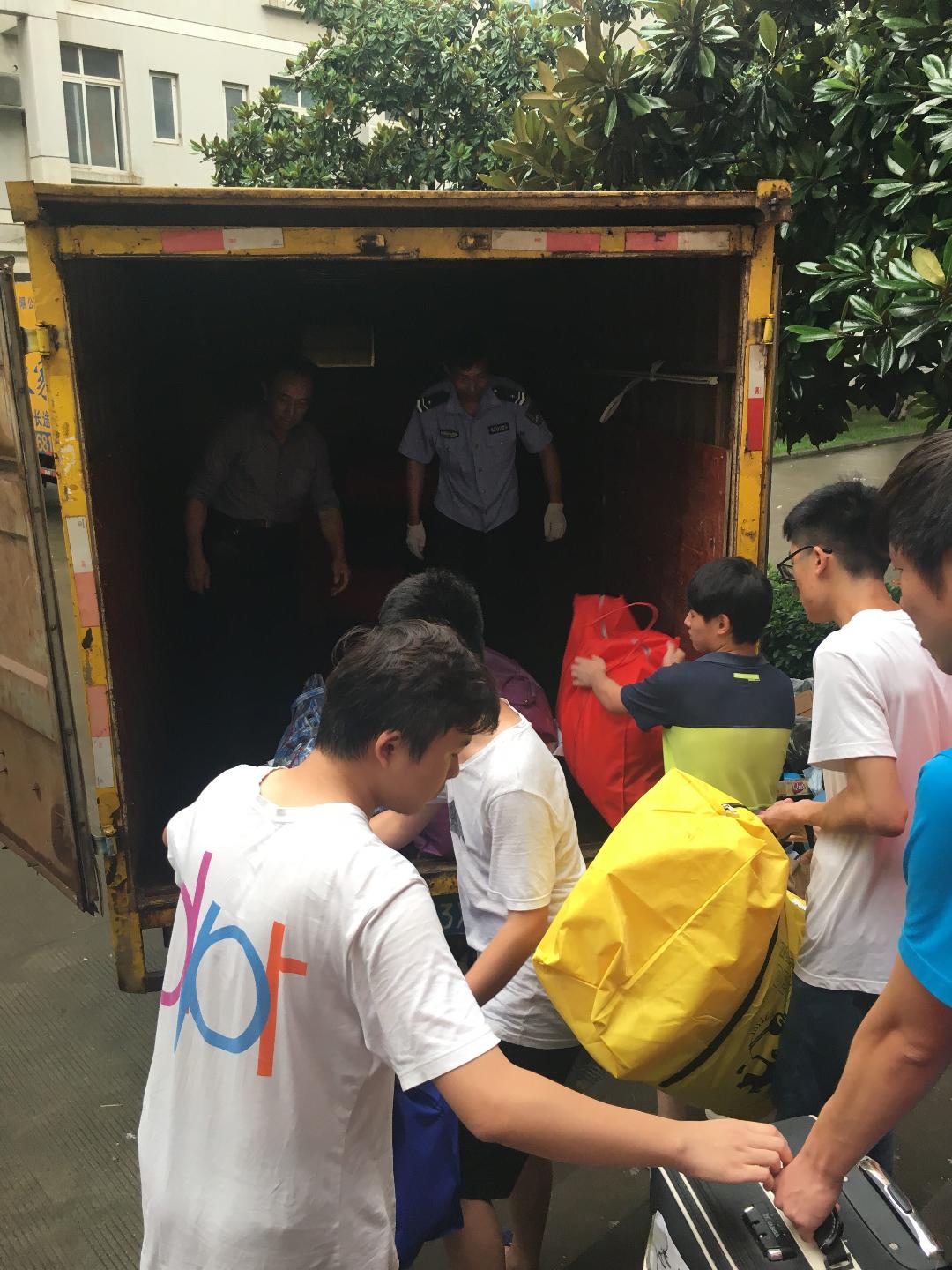 7月2日清晨5:30,回迁工作冒雨继续进行。通识教育学院全体工作人员发扬大无畏精神,顶着暴雨将学生的行李搬运上车,组织学生有序乘车,现场秩序丝毫不受暴雨影响,暖意弥漫在学生们的心间。学院安排了13辆客车和23辆货车分别运送学生及行李,每辆车都安排了跟车工作人员,确保学生和行李安全。下午3:30左右,最后一批学生和行李安全抵达校本部。