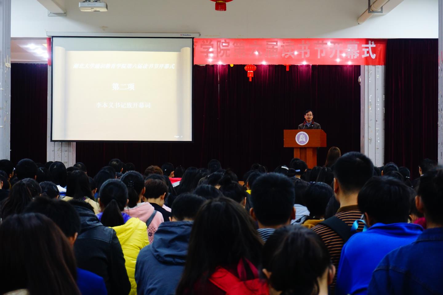 开幕式在第五届读书节回顾和第六届读书节宣传视频中拉开帷幕。院党委书记李本义致辞。他说,书籍是人类最宝贵的精神财富,是人类进步的阶梯;书籍带给人们智慧与文明,教人思索与进取。学院办学五年多以来,始终贯彻以“人格塑造、知识学习、能力锻炼”为核心要素的通识教育理念,通过启发、引导学生内在的教育需求,创建和谐的教育环境,有目的、有计划地组织系列读书活动,努力培养学生“爱读书、会读书、读好书”的自主阅读习惯,切实加强学生自我养成教育基地建设。他向同学们提出三点希望:一是希望同学们养成常读书的行动自觉,通过读书积累知识、丰富阅历,不断提升自身的综合素质;二是希望同学们多读经典名著,在网络互联互通的时代沉下心来品味名师大家的原著,开启智慧、升华涵养;三是希望同学们在读书的过程中有所思、有所悟,通过阅读体味人生、感悟生命,建立起远大的志向,同时在读书中陶冶情操、健全人格。