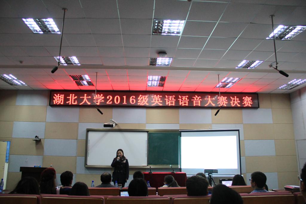 12月12日晚6点,由湖北大学教务处、外国语学院、通识教育学院主办,英语广播台承办的2016级英语语音大赛决赛在B300教室顺利举行。来自大一校本部的3位选手和通识教育学院的12位选手经过初赛和复赛的重重选拔,在数百位选手中脱颖而出。外国语学院5位教师应邀参加此次决赛评审工作,对参赛选手进行评分。主办单位有关负责人出席决赛。