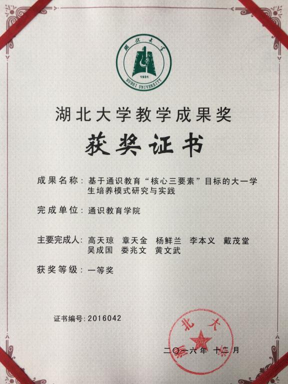 在近日召开的湖北大学2016年教学工作表彰大会上,我院教学研究成果“基于通识教育‘核心三要素’目标的大一学生培养模式研究与实践”荣获学校教学成果奖一等奖。