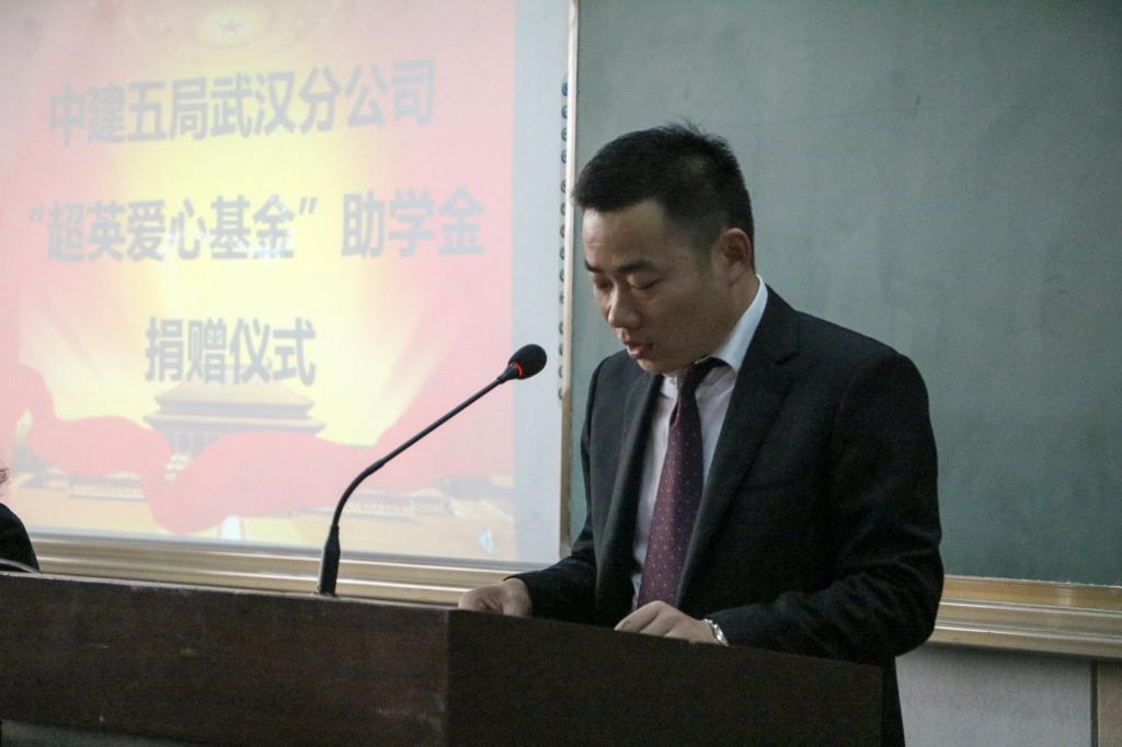 汤光乾介绍了该公司“超英爱心基金”的创办情况和中建五局武汉分公司的基本情况。他表示,捐资助学是一项功在当代、利在千秋的事业,也是中华民族的传统美德,公司希望能通过这样的公益活动,带动更多有社会责任的企业和爱心人士加入各类回馈社会活动中。他希望受资助的同学珍惜来之不易的学习环境,珍惜宝贵的青春年华,以刻苦自励的精神,学好知识、掌握新本领、增长新才干。