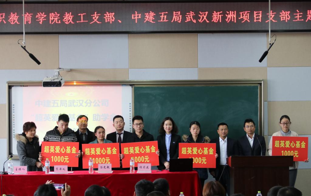 主题党日第一项活动,首先在B300录播室隆重举行了中建五局武汉分公司“超英爱心基金”助学金捐赠仪式,通识教育学院五名品学兼优的贫困学子分别获得捐助1000元。通识教育学院副院长颜弟东主持捐赠仪式。汤光乾经理、李本义书记和受助学生代表分表发言。