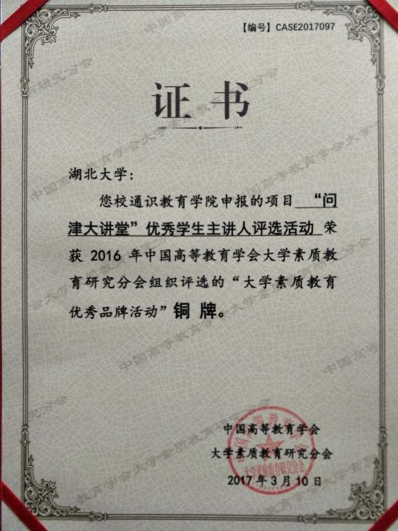 此次大会还宣布了大学素质教育优秀品牌活动的评选结果获奖名单并举行了颁奖仪式。我院申报的“问津大讲堂”优秀学生主讲人评选活动项目荣获研究会组织评选的2016年“大学素质教育优秀品牌活动”铜奖。