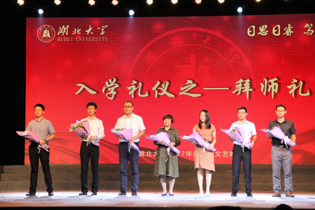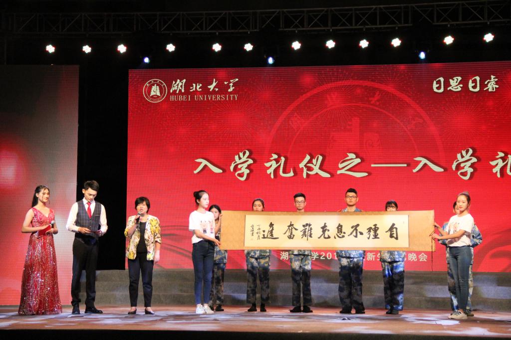 值得一提的是,晚会还穿插举行了“入学礼”“拜师礼”和“敬旗礼”等入学仪式。杨鲜兰在入学仪式上为六位新生代表颁发学生证、佩戴校徽,将学校书法名师周厚洪题写的“自强不息克难奋进”赠送给通识教育学院的同学们,把最美好的祝福送给了2017级的新生。杨鲜兰向同学们深入浅出地讲解了湖北大学“习坎精神”的内涵,希望同学们能够在以后的日子里永不放弃、克难奋进,将习坎精神传递下去,为实现中华民族伟大复兴的中国梦做出贡献。