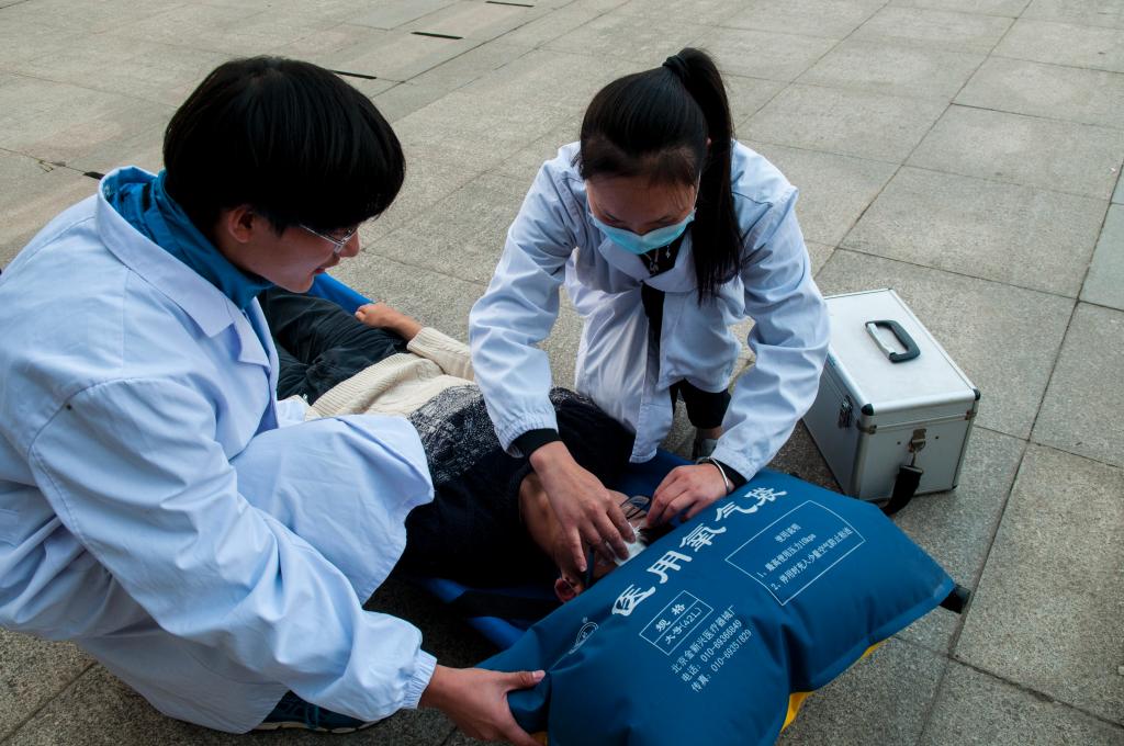 随着警报响起,电路切断,消防演练正式开始。浓烟中,学生们在老师与消防官兵的指导下,按照指定路线紧张有序地撤离到安全地带。在主席台前,医务人员对模拟伤员进行了包扎,为学生展示了应急处理伤员的正确方法。随后,阳逻武警消防中队的消防官兵为学生现场传授了灭火器的使用技巧,并邀请学生参与互动,实地操作灭火器。
