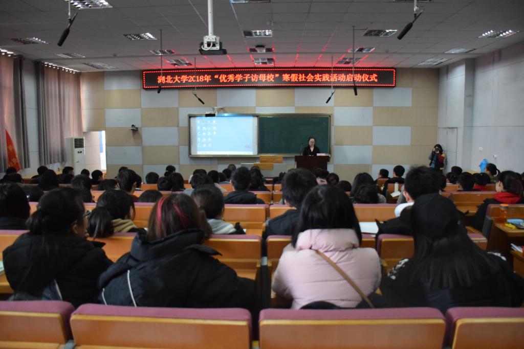 1月10日上午,湖北大学2018年“优秀学子访母校”寒假社会实践活动启动仪式在通识教育学院举行。副校长钱建国出席启动仪式并讲话。招生就业处、校团委、通识教育学院等单位负责人及150多名学生志愿者代表参加仪式。招生就业处处长李莉主持仪式。
