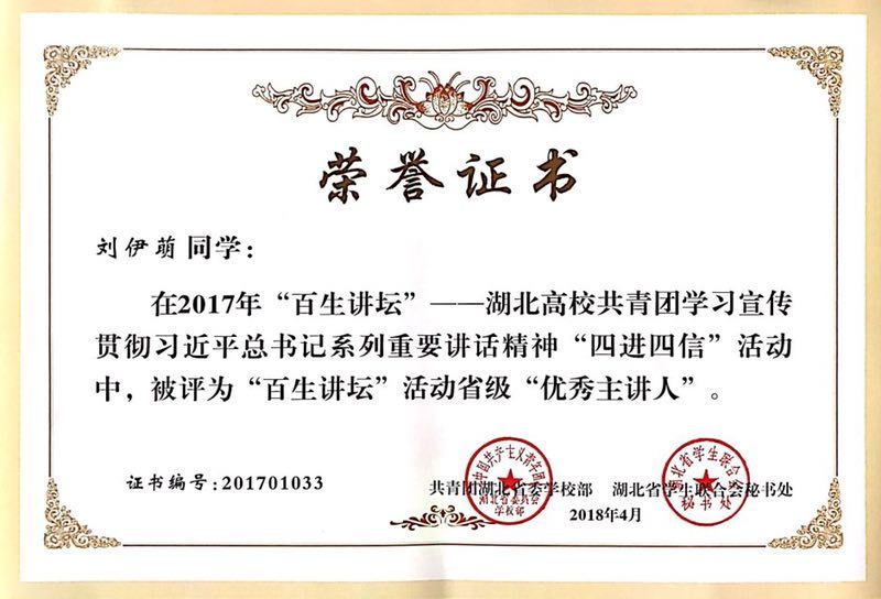 2015年5月以来,共青团湖北省委在全省高校广泛开展了“百生讲坛”——学习宣传贯彻习近平总书记系列重要讲话精神“四进四信”活动,由青年学子用自己的真实感悟宣传习近平总书记系列重要讲话精神。活动启动以来,通识教育学院团委紧扣“百生讲坛”主题,先后开展“百生讲坛五个一百工程”、“学习宣传贯彻党的十九大精神”“七个一”活动等系列活动,成立“学习贯彻十九大精神青年宣讲团”。在省级比赛中,我院刘伊萌同学获评2017年度“百生讲坛”省级优秀主讲人。