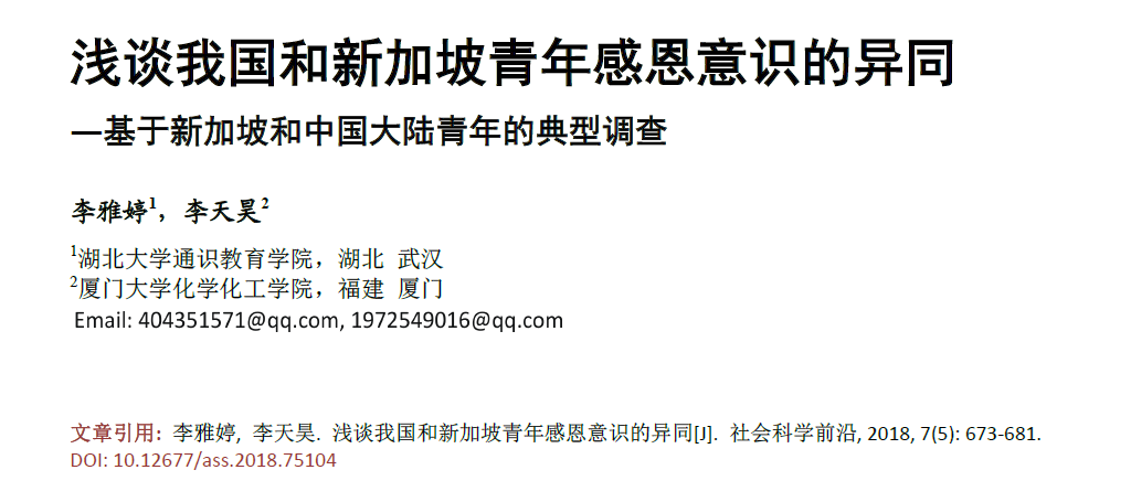 走访过程中,李宗荣教授对知识的渴望与勇于开拓创新的精神深深地感染了李雅婷等几位同学,师生之间很快结下了深厚友谊。随后,在李教授的指导和推荐下,李雅婷同学以第一作者身份撰写了学术论文《浅谈我国和新加坡青年感恩意识的异同——基于新加坡和中国大陆青年的典型调查》,并于2018年5月25日发表在《社会科学前沿》(Advances in Social Sciences)杂志上。