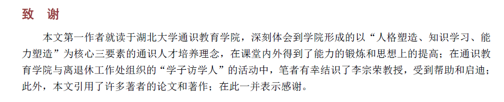 该论文末尾致谢部分写道,“本文第一作者就读于湖北大学通识教育学院,深刻体会到学院形成的以‘人格塑造、知识学习、能力塑造’为核心三要素的通识人才培养理念,在课堂内外得到了能力的锻炼和思想上的提高;在通识教育学院与离退休工作处组织的‘学子访学人’的活动中,笔者有幸结识了李宗荣教授,受到帮助和启迪”。