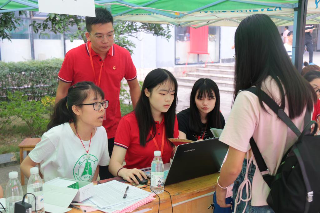 迎新现场热闹非凡:在各专业迎新咨询处,工作人员查验通知书、发放校园卡、登录信息,并与新生交流;在家长休息区,家长们在帐篷里纳凉休息,边等孩子边拉家常;在绿色通道办公室里,工作人员热情帮助学生办理相关登记手续;在军训服发放点,工作人员认真清点军训用品并发放到新生手中。学院还安排了车辆,于各火车站和校区之间接送新生及家长;为当晚未返程的家长准备了休息区,并提供凉席。