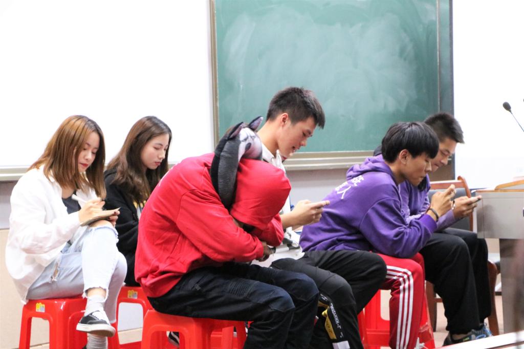 学生们在班会上演绎了两组小品:《旷课》夹杂着武汉方言,讲述了学生睁不开眼皮,想逃掉体育课的故事;《糟课堂》讲述了学生课上玩手机被老师发现却不想上交,课上睡觉、化妆各种现象乱成一团的故事。2018级播音与主持艺术专业的王嘉宁根据“上课,爱听不听”表达了自己独特的见解:上课,爱,听不?听。