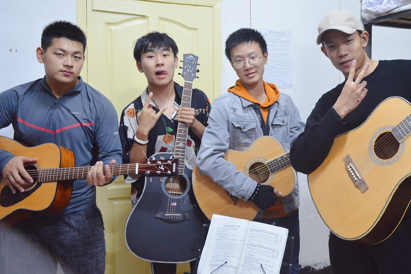 一栋的214宿舍被称为音乐宿舍。宿舍里的四个男孩原本素不相识,在自我介绍的时候,才知道原来大家有着共同的爱好:音乐。于是,他们组了一个叫做“情人节”的乐队。Rapper、吉他手、B-boxer和主唱,各兼其职。在宿舍里面,他们有时各唱各的,互不干扰;有时一同合唱一首歌;有时会相互交流吉他等乐器……乐队的B-boxer、播音与主持艺术专业学生陈秋实说道:“我们经常唱歌,没有规定的时间,只要一人开唱,大家都会跟着唱起来。”军训期间,他们还曾背上吉他、提上音响去其他不认识的同学的宿舍唱歌。一进门,乐队成员就关掉同学宿舍的灯,挥动着打开闪光灯的手机开始演唱,一曲完毕,他们就转身离开。陈秋实对此解释道:“音乐就是我们的语言,我们通过音乐来结交朋友。”日前,214情人节乐队在学院的学风建设示范班会上表演。“我们希望以后能更多地参加各种活动展示自己,也想出一首自己的歌。”214宿舍成员们表达了自己对未来的期望。