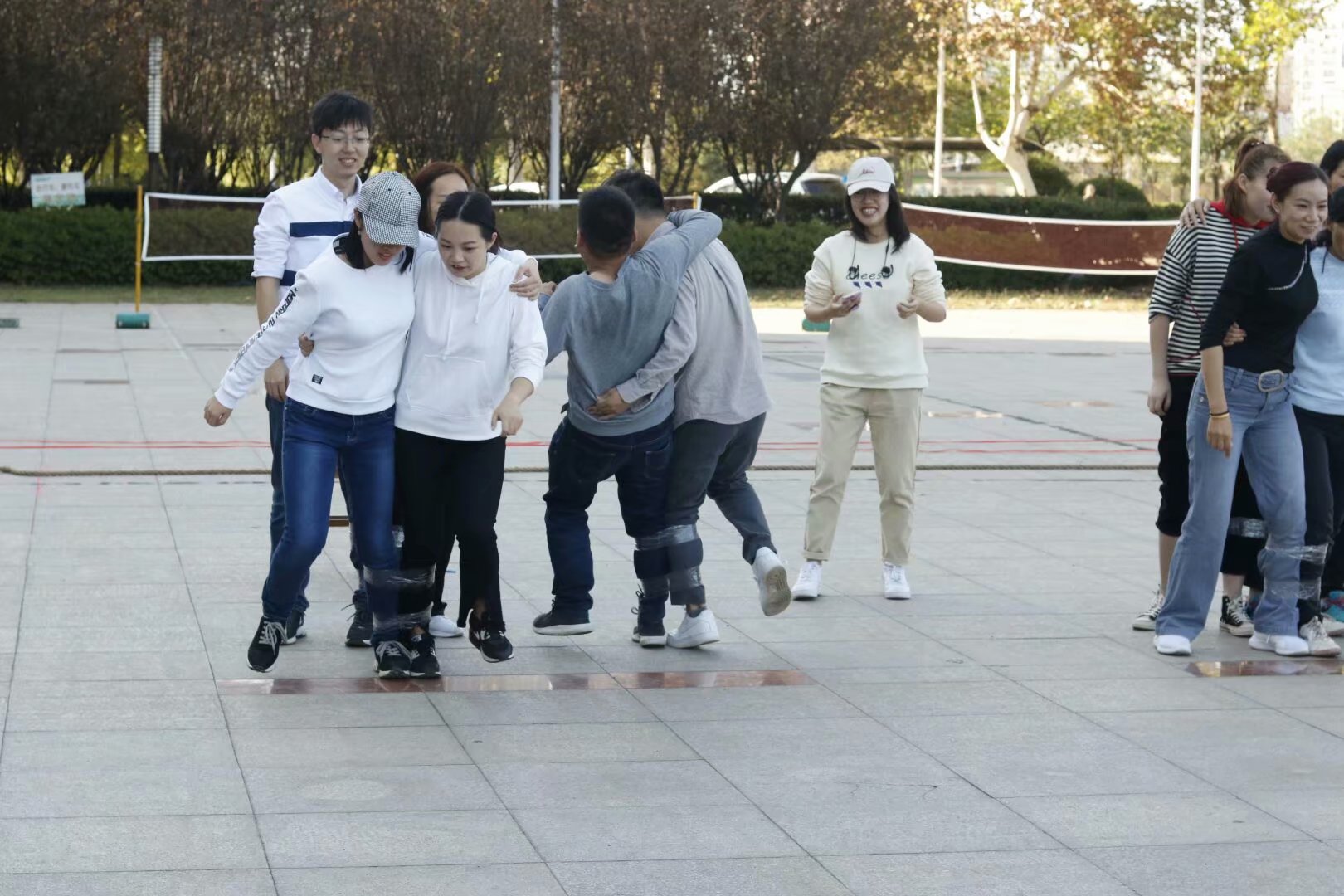 “你先迈左脚,跟着我的步子。”“快快快!”……教职工运动会最后一个运动项目两人三足正在进行。两人为一组用胶带将两条腿绑住进行赛跑,比赛开始前,老师们先进行默契度的磨合。比赛现场状况频出:一个跑快了,另一个踉跄;一个想左转弯,另一个却向右转……广场上欢呼声、谈笑声、叫喊声不断,比赛在愉快的气氛中顺利结束。