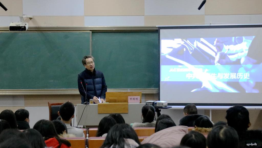 12月12日晚,哲学学院党委书记万明明为通识教育学院第27、28期入党积极分子作题为“从红歌的演绎中追寻中共的产生与发展历史”的党课辅导报告。