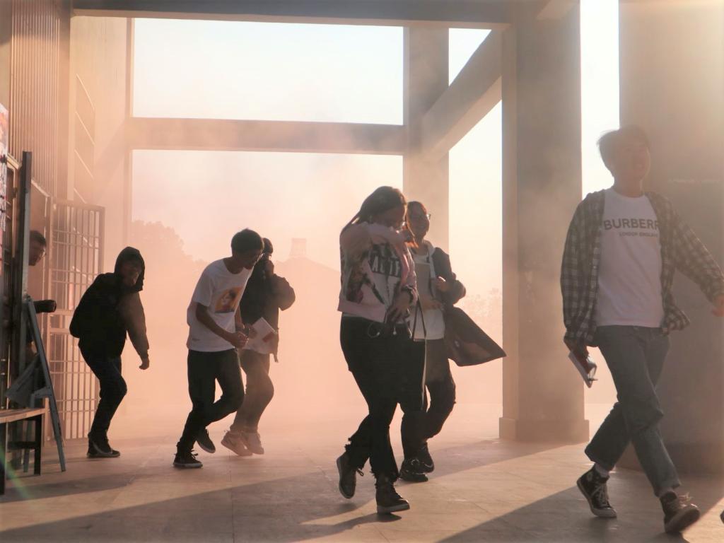 下午15点30分,参演消防演练的师生在15个指定教室内观看了消防知识宣传片,该宣传影片主要介绍了火灾的预防、正确的灭火方法,以及火场逃生等自救知识;16点整,保卫部工作人员在教学楼内点燃了烟雾弹,消防车拉响警报驶入校园,1000余名师生开展了火场逃生演练,师生们冒着浓烟从教学楼安全有序疏散到教学楼广场;随后,阳逻消防中队的王教官为师生们示范了如何使用灭火器,并讲解在灭火器使用过程中相关注意事项。部分学生也亲自实践,切身体会了灭火器灭火的操作方法。